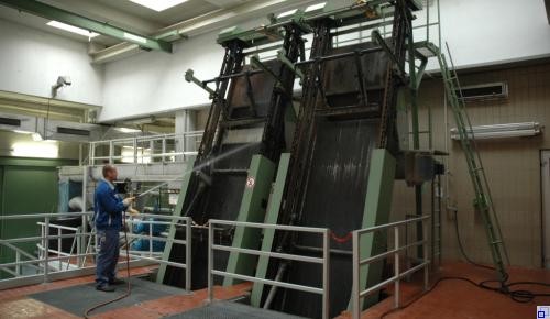 In der Vorreinigungsanlage durchläuft das Abwasser mehrere mechanische Reinigungsstufen. In der Rechenanlage sorgen Feinrechen dafür, dass Grobstoffe wie Lumpen oder Papier aus dem Abwasser entfernt werden. Über eine Förderanlage werden diese zur Auswaschung der organischen Stoffe und zur Entwässerung zur Waschgutpresse transportiert. Das Rechengut wird dann in Containern gesammelt und entsorgt.